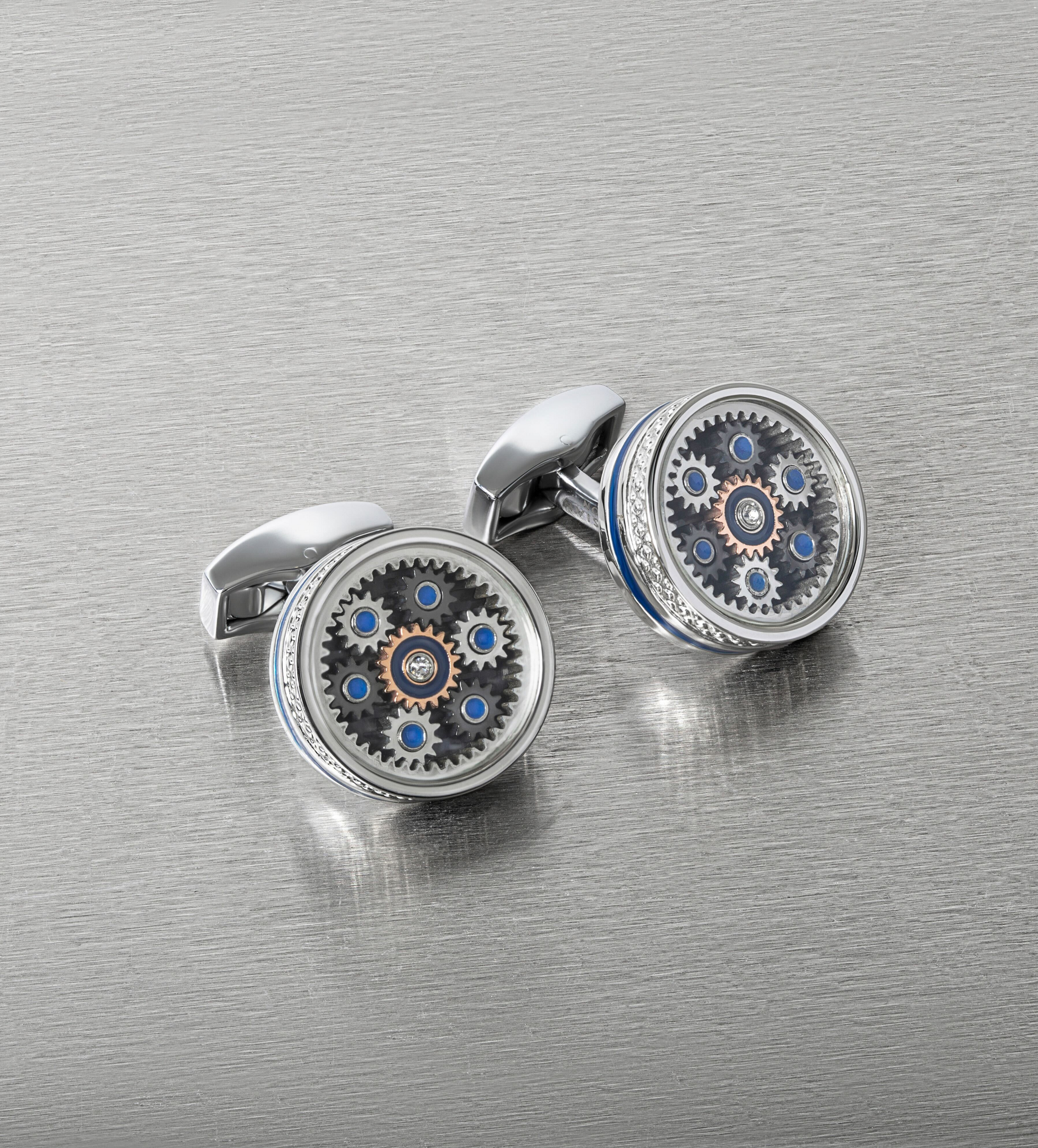 Round Skeleton Gear static cufflinks with black enamel in Palladium Plated