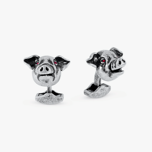 Mechanical Pig Cufflinks With Red Swarovski Elements In Oxidised Silver