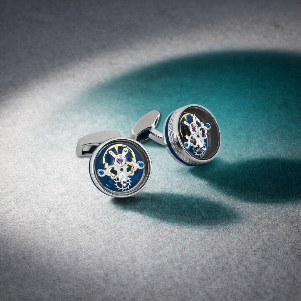 Orbit Gear Cufflinks in Yellow Gold Plated & Blue Enamel