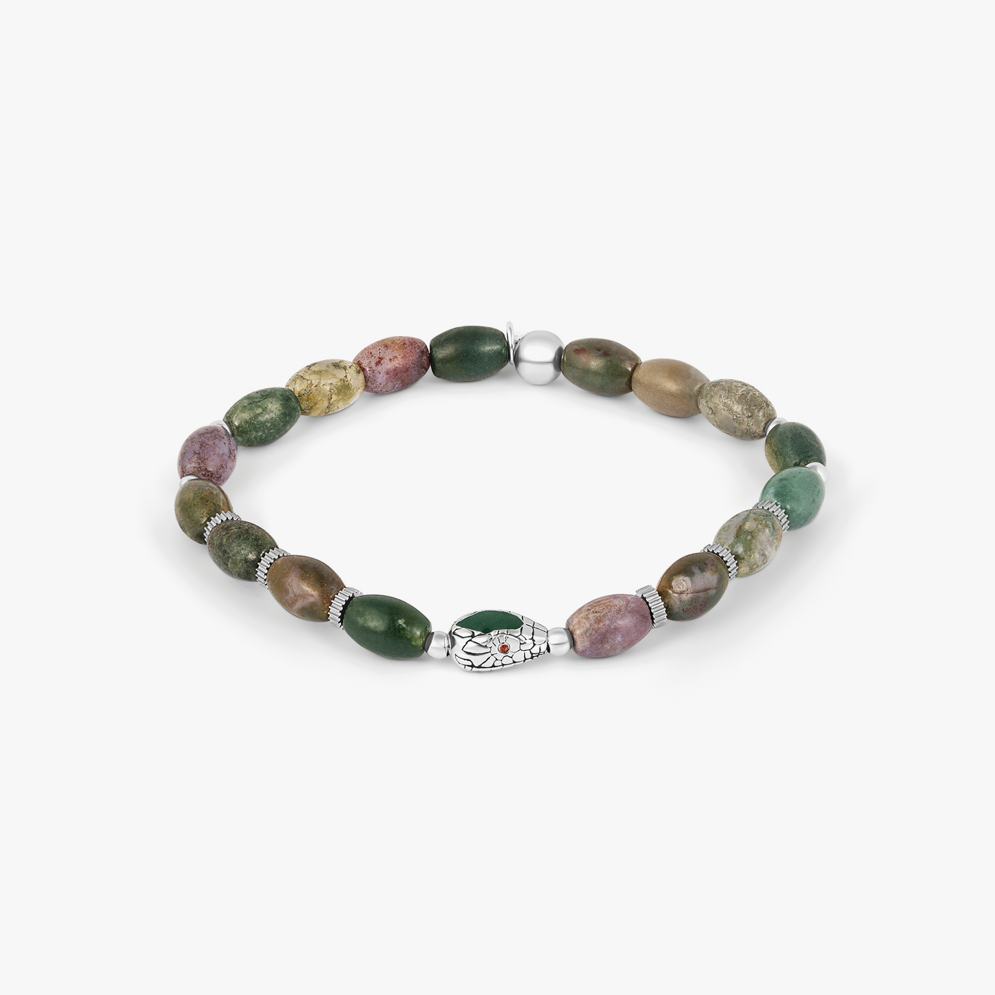 Featuring oval beads of Indian jasper interspersed with delicate gears crafted from rhodium-plated sterling silver; the bracelet has been uniquely crowned with an oval snake's head finished with hand-painted green enamel.