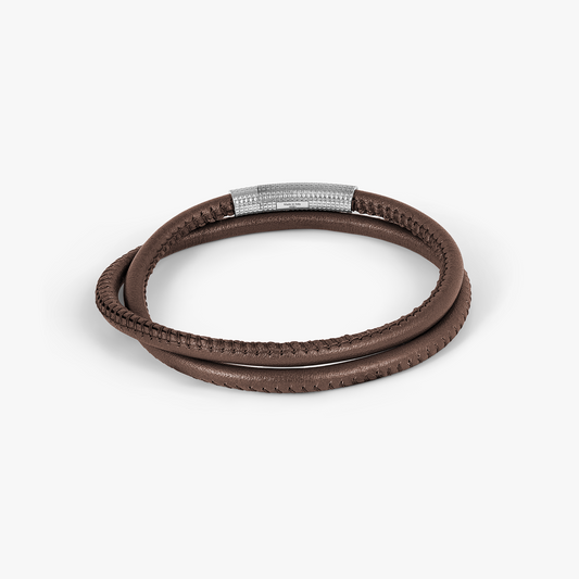 Giza Click Stitch Pelle Bracelet In Rhodium & Brown Leather
