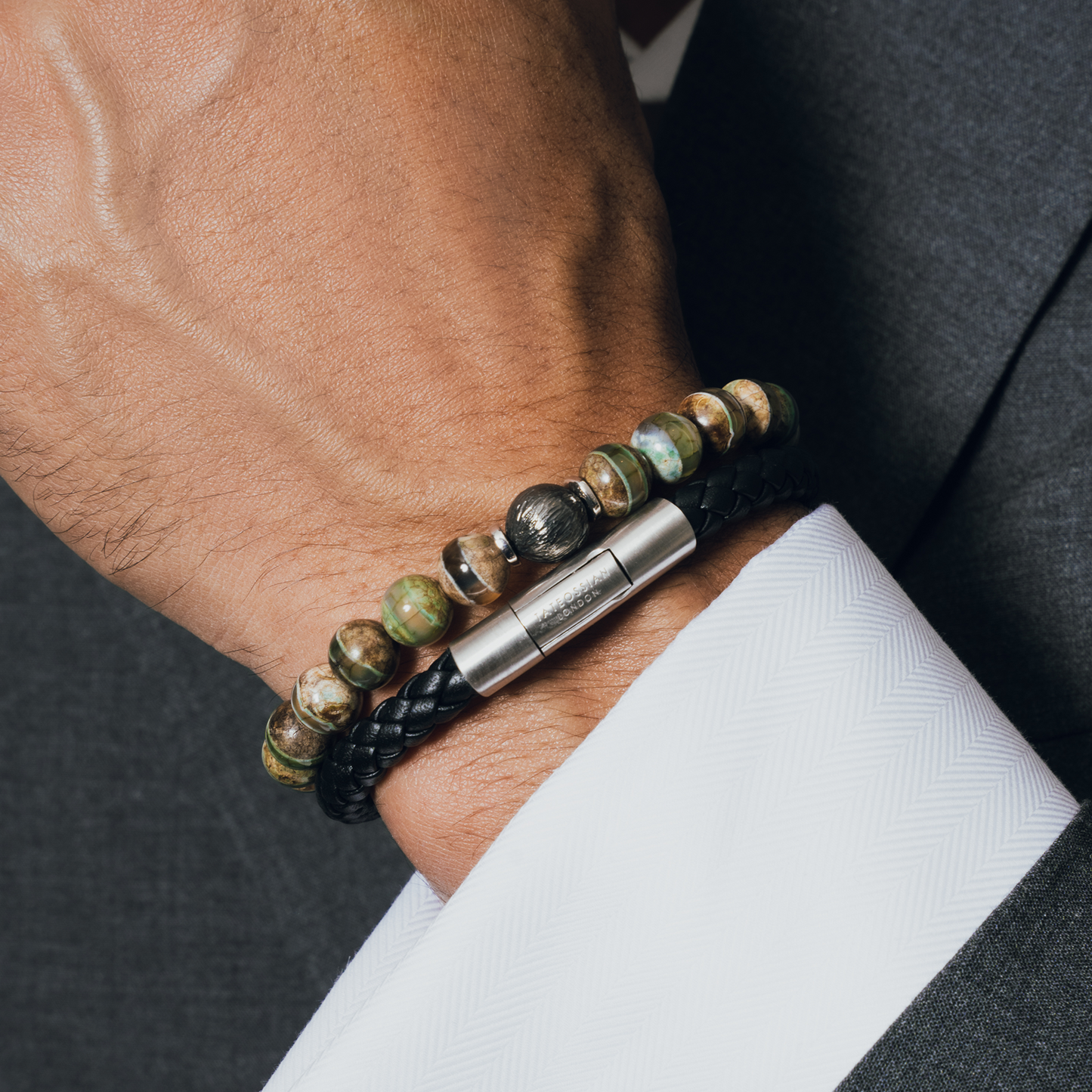 Charles Click Pelle Bracelet In Rhodium & Black Leather