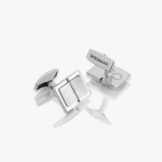 Round Square Graffiato Cufflinks In Rhodium Plated Sterling Silver With White Mother Of Pearl and White Sapphires
