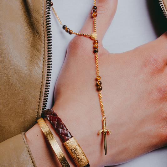 Capri Dagger Rosary Necklace In 18K Yellow Gold Plated Silver With Tiger Eye