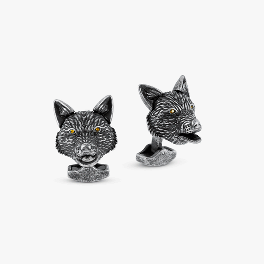 Fox Mechanical Cufflinks With Yellow Swarovski Elements In Oxidised Silver