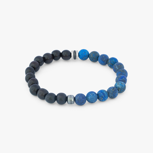 Gear Trio Beaded Bracelet In Rodium Plated Silver With Ebony Wood & Blue Lapis