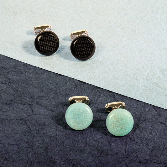 THOMPSON Woven Round Cufflinks In White Bronze plated Base Metal With Blue Jade
