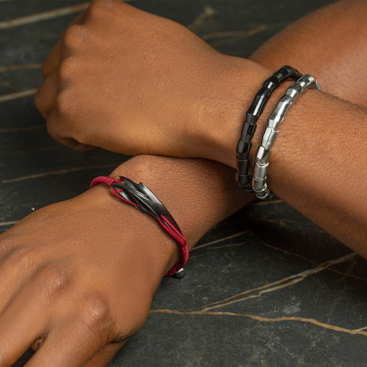 ZAHA HADID DESIGN Tyne bracelet in brushed black IP stainless steel and burgundy macrame
