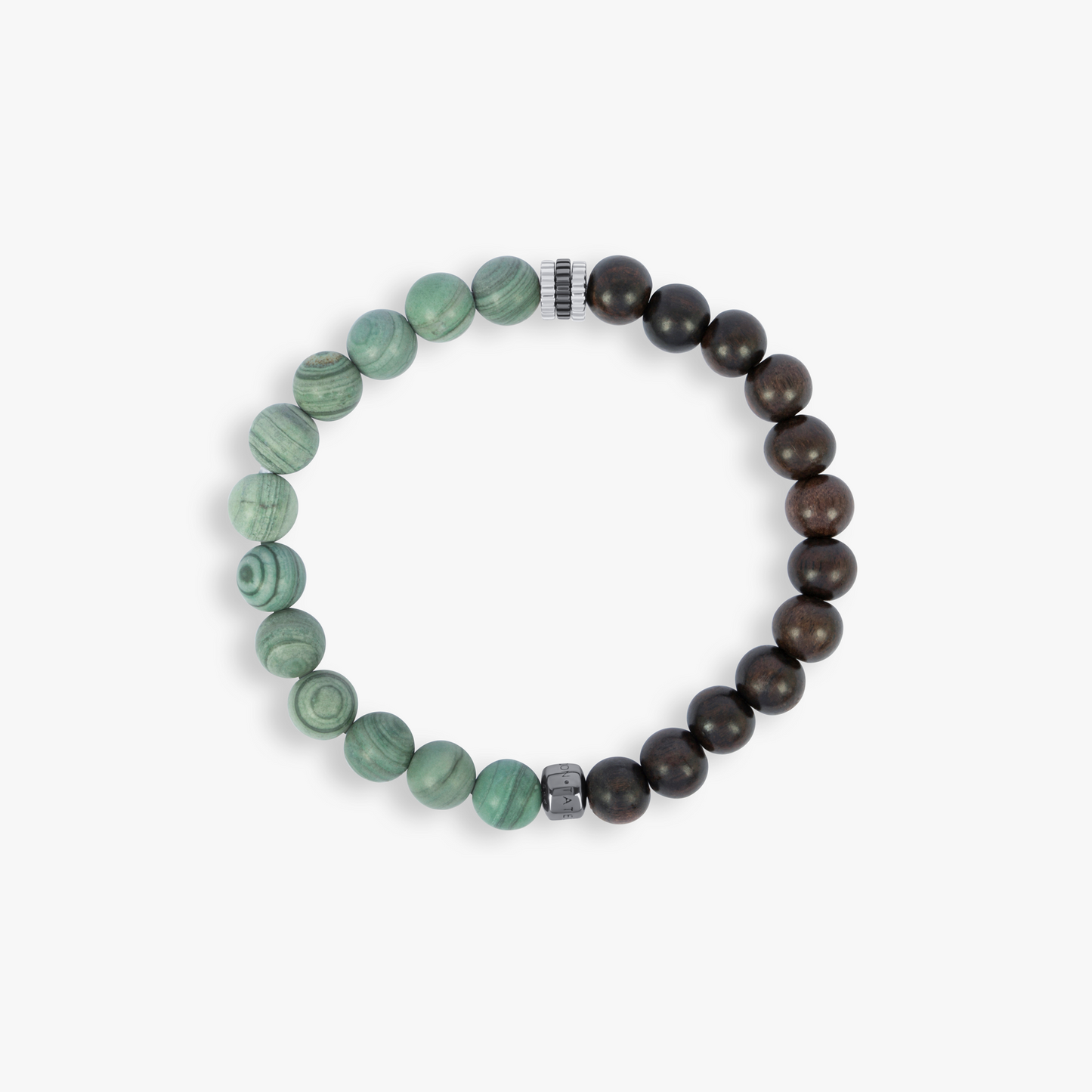 Gear Trio Beaded BraceletRhodium Plated Silver With Ebony Wood and Green Jasper